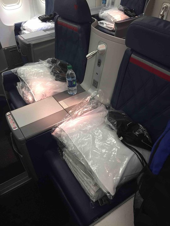 This aircraft features Thompson Solutions Vantage flat-bed sleeper seats arranged in a staggered pattern, featuring wide armrests that also serve as a footwell for the passenger seated behind. All seats have direct aisle access in this configuration. These seats are different than the new Delta One seats found onboard Delta's 777 aircraft which are arranged in a herringbone pattern.